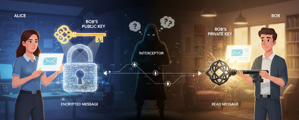- Decryption: Only Bob’s Private Key can unscramble the message.