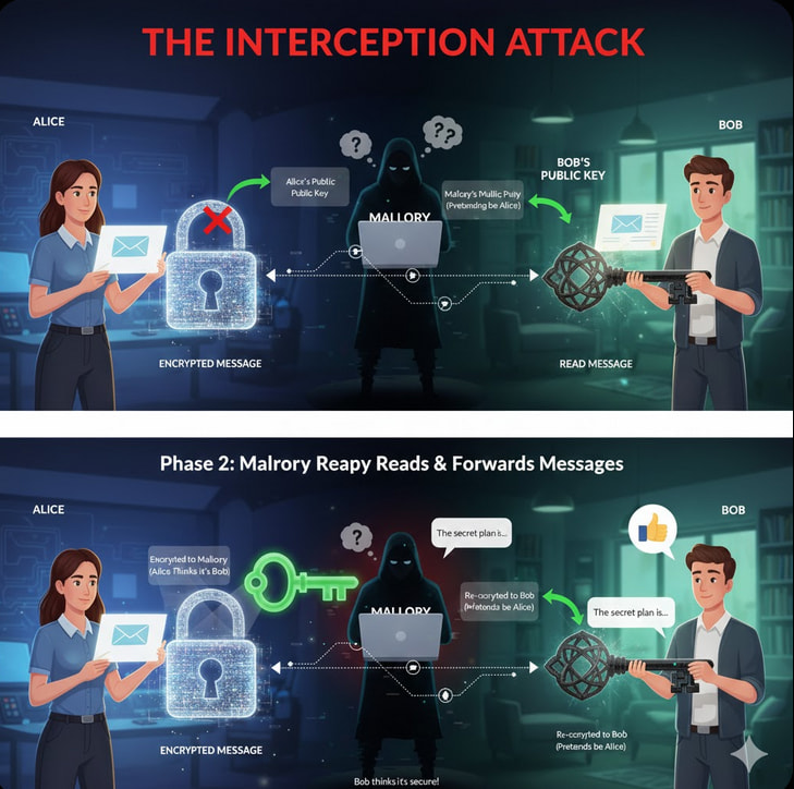 Interception (a Man-in-the-Middle attack) is more subtle. An attacker named Mallory intercepts the initial unencrypted communication where Alice and Bob are exchanging their Certificates.